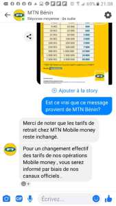 Après cette étape de la vérification, nous avons envoyé un message sur la page Facebook de MTN Bénin pour leur demander s’ils sont auteurs de l’image. Voici leur message : « Merci de noter que les tarifs de retrait chez MTN Mobile money restent inchangés. Pour un changement effectif des tarifs de nos opérations Mobile money, vous serez informé par le biais de nos canaux officiels ».
