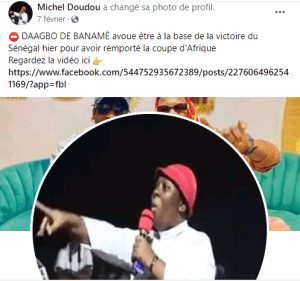 Voici le texte de la publication: « DAAGBO DE BANAMÈ avoue être à la base de la victoire du Sénégal hier pour avoir remporté la coupe d’Afrique Regardez la vidéo ici