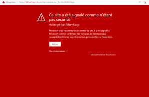 Remarquons que dès qu’on clique sur le lien, le nom du domaine change. Il devient « fdfnmf.to ». Le navigateur Microsoft Edge, informe que « Ce site a été signalé comme n’étant pas sécurisé ». (confère capture d’écran ci-dessous)