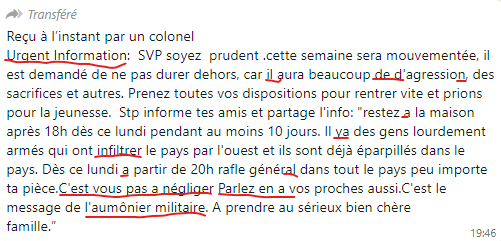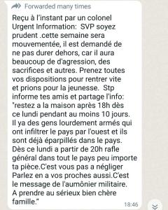 Un message écrit et un audio (en langue nationale Goungbé) faisant état d’une interdiction faite aux populations de sortir dans la nuit, au-delà de 20h, ont été diffusés dans des groupes whatsapp en début de cette semaine. Nous les avons reçus d’un citoyen qui était très inquiet vu la gravité de la situation décrite.