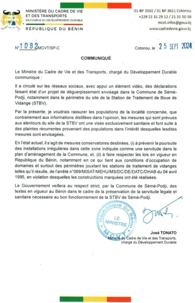 Le moins qu’on puisse dire est que Djamiou Babatoundé avait l’air très inquiet de la situation. Il a pris le soin de filmer sa maison ainsi que la rue dans laquelle il réside. Son action n’a pas été sans conséquence. Très vite, le message est parvenu aux autorités béninoises. Le ministre du Cadre de vie et des transports, chargé du développement durable, José Didier Tonato, a tenté de rassurer les populations. Il s’est exprimé à travers un communiqué en date du mercredi 25 septembre 2024 et publié à la même date sur la page officielle du gouvernement. « Les mesures qui sont prévues aux alentours du site de la Station de Traitement de Boue de Vidange (STBV) ont une visée exclusivement sanitaire et font suite à des plaintes récurrentes provenant des populations dans l’intérêt desquelles lesdites mesures sont envisagées », peut-on lire.