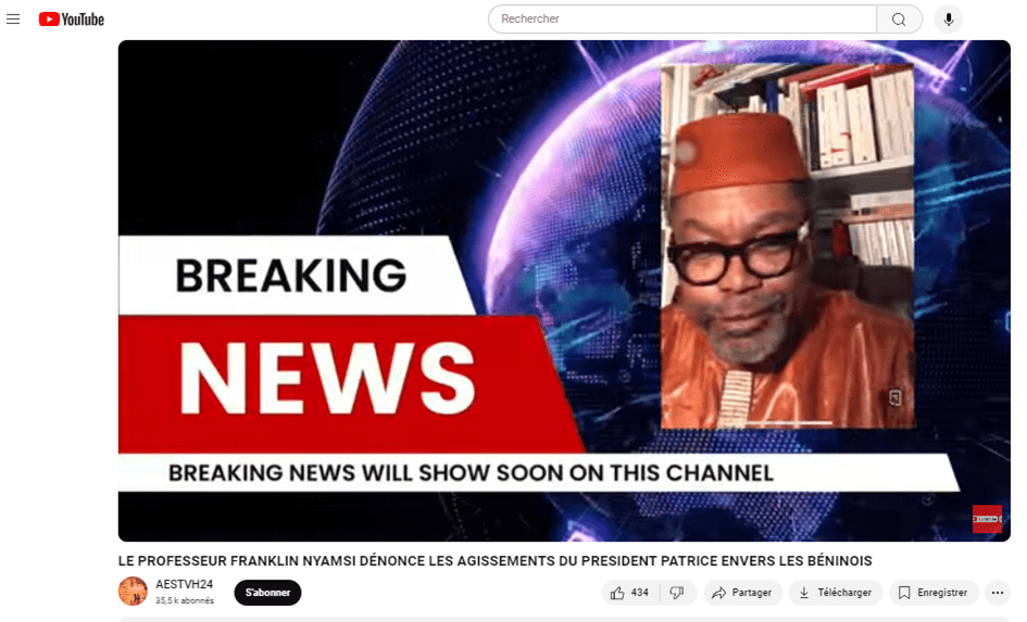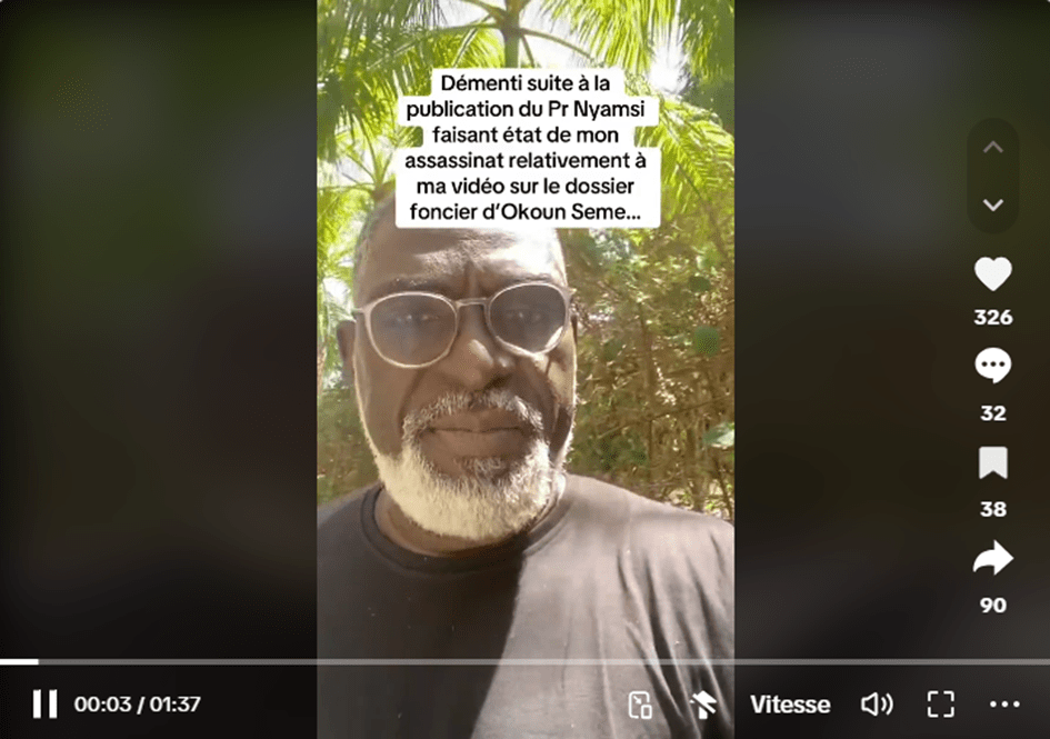 Réputé pour ses publications et interventions le plus souvent critiques, Franklin Nyamsi a fait des déclarations au sujet d’un prétendu assassinat au Bénin. Il tient pour responsable le gouvernement béninois. Les propos du Camerounais viennent en réaction à une vidéo publiée en septembre 2024 par Djamiou Babatoundé, l’une des victimes d’une supposée expropriation dans la commune de Sèmè-Podji (Bénin). Mais ce dernier vit toujours. Il n’est pas mort, comme l’a affirmé Franklin Nyamsi. Bénin Check l’a contacté pour en avoir la confirmation.