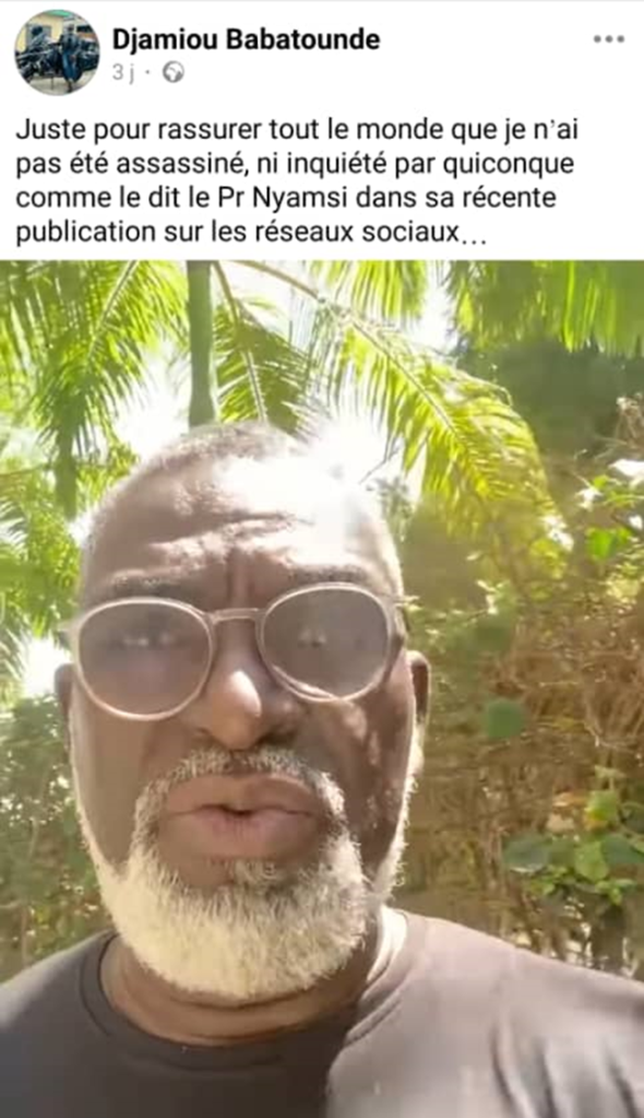 « Et on me dit que le monsieur en question a été assassiné quelques jours après cette révélation. Le monsieur a été assassiné, me dit-on, après cette révélation ; exactement les mêmes méthodes que Ouattara (…) Ils ont tué le monsieur qui fait cette vidéo », a lancé Franklin Nyamsi pendant qu’il faisait visionner la vidéo de Djamiou Babatoundé à ses followers. Mais avec une certaine certitude, il s’est répété en d’autres termes. « Le monsieur qui a montré tout le complexe qu’il a construit, on m’informe que ce monsieur a été assassiné après la révélation de spoliation qui se préparait contre lui et ses voisins », a insisté Franklin Nyamsi. Sauf que ses affirmations ne sont pas du tout justifiées. Djamiou Babatoundé n’a pas été victime d’une quelconque tentative d’assassinat depuis la publication de sa vidéo.