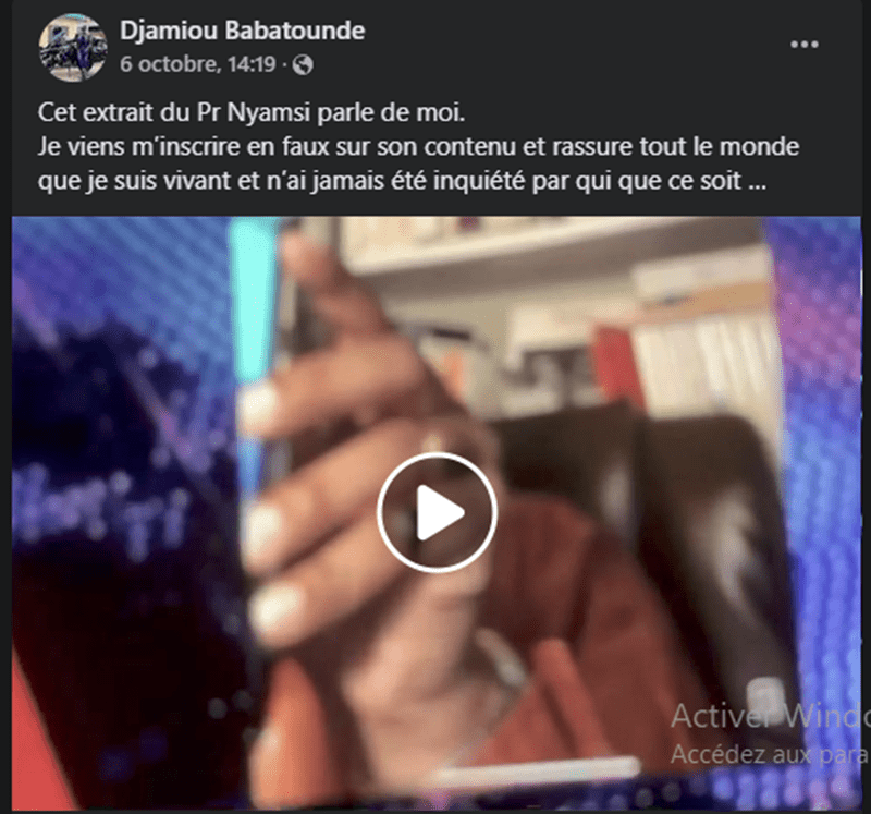 « Bonjour, nous sommes dimanche 6 octobre 2024. Je me sens dans l’obligation de faire cette nouvelle vidéo pour démentir une nouvelle information qui circule, notamment la vidéo du professeur Nyamsi qui fait état de mon assassinat. Souvenez-vous, je suis le monsieur qui avait fait une vidéo qui a circulé sur les réseaux sociaux, relativement au projet d’expropriation à Sèmè. Un projet qui, depuis le temps, a été clarifié par le ministre du cadre de vie dans un communiqué. Cette situation n’est plus du tout d’actualité, les choses ont été clarifiées », a fait savoir Djamiou Babatoundé.