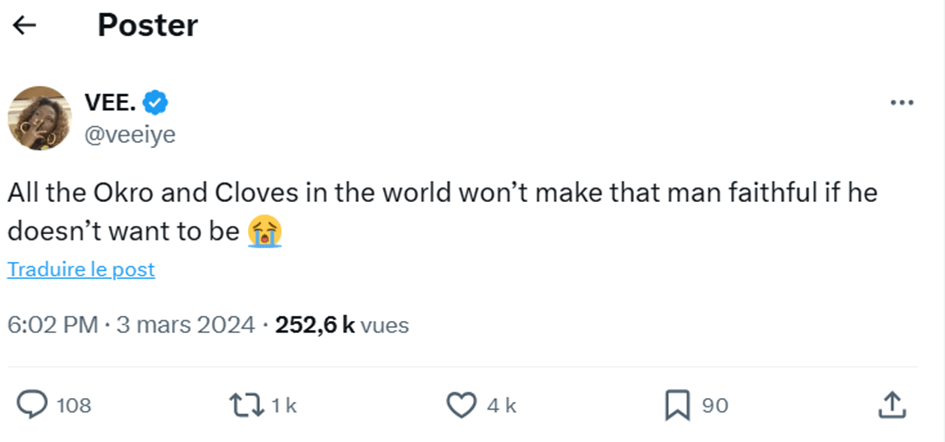 Cette rumeur à propos de l’eau de gombo avait fait un tollé sur la toile il y a bientôt 8 mois. La chanteuse nigériane Tiwa Savage a publié sur Instagram une photo d’une bouteille un peu curieuse. Le bocal contenait de l’eau et des tranches de gombo. De quoi créer la polémique. Les uns soutiennent que la consommation d’une cette boisson à l’eau de gombo aiderait les femmes à rendre leurs maris accrocs d’elles. On se rend bien compte que ce n’est pas pour les mêmes raisons que celles évoquées par Cynthia KA (@by_cynthia_ka). Tiwa Savage n’a pas eu que des retours positifs cependant. « Tout le Gombo et les Clous de Girofle du monde ne rendront pas un homme fidèle s’il ne veut pas l’être », avait déclaré la très célèbre VEE sur sa page officielle X le 3 mars 2024. Tout comme elle, beaucoup ont contesté cette pratique et ont accusé l’artiste nigériane de ne pas être un bon exemple pour ses fans.