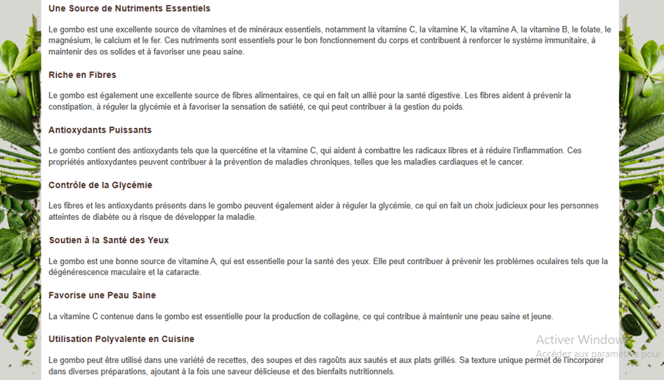 Cynthia KA (@by_cynthia_ka) a peut-être raison au sujet de certaines fonctions de sa recette. Mais pour ce qui est de la sécheresse vaginale, cela reste encore à prouver. En dehors de la vitamine A et B dont a fait cas l’auteure de ladite vidéo, le gombo est également composé de la vitamine C, la vitamine K, le folate, le magnésium, le calcium et le fer. « Ces nutriments sont essentiels pour le bon fonctionnement du corps et contribuent à renforcer le système immunitaire, à maintenir des os solides et à favoriser une peau saine », renseigne la plateforme spécialisée bio Magellan Bio. Le gombo est également riche en fibres alimentaires qui permettent de faciliter la digestion, puis de réguler la glycémie. Selon la même source, ce légume-fruit contient des antioxydants puissants pour prévenir certaines maladies cardiaques et le cancer. Plusieurs autres vertus sont recensées par Magellan Bio, mais un apport du gombo pour aider contre la sécheresse vaginale n’y figure pas.