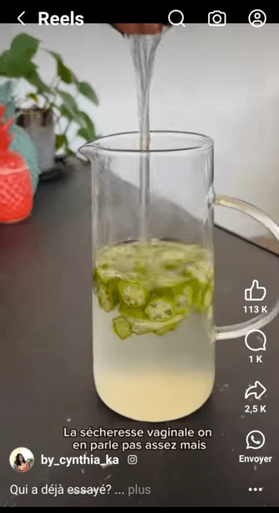 Depuis peu, il est fréquent de voir plusieurs recettes circuler sur les réseaux sociaux pour lutter contre certaines maladies ou maux. C’est le cas d’une vidéo publiée le 9 octobre 2024 sur Instagram par Cynthia KA (@by_cynthia_ka). Cet élément visuel fait la recommandation d’une recette naturelle pour aider les femmes souffrant de sécheresse vaginale. « L’expérience prouve que c’est l’eau de gombo qu’il vous faut », a-t-elle dit. Cette publication a suscité plus de 115 000 réactions (113 000 j’aimes, 1100 commentaires et 2500 partages). L’information qu’elle véhicule est pourtant fausse.