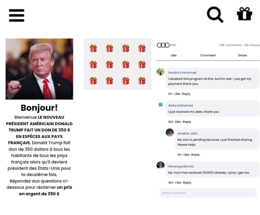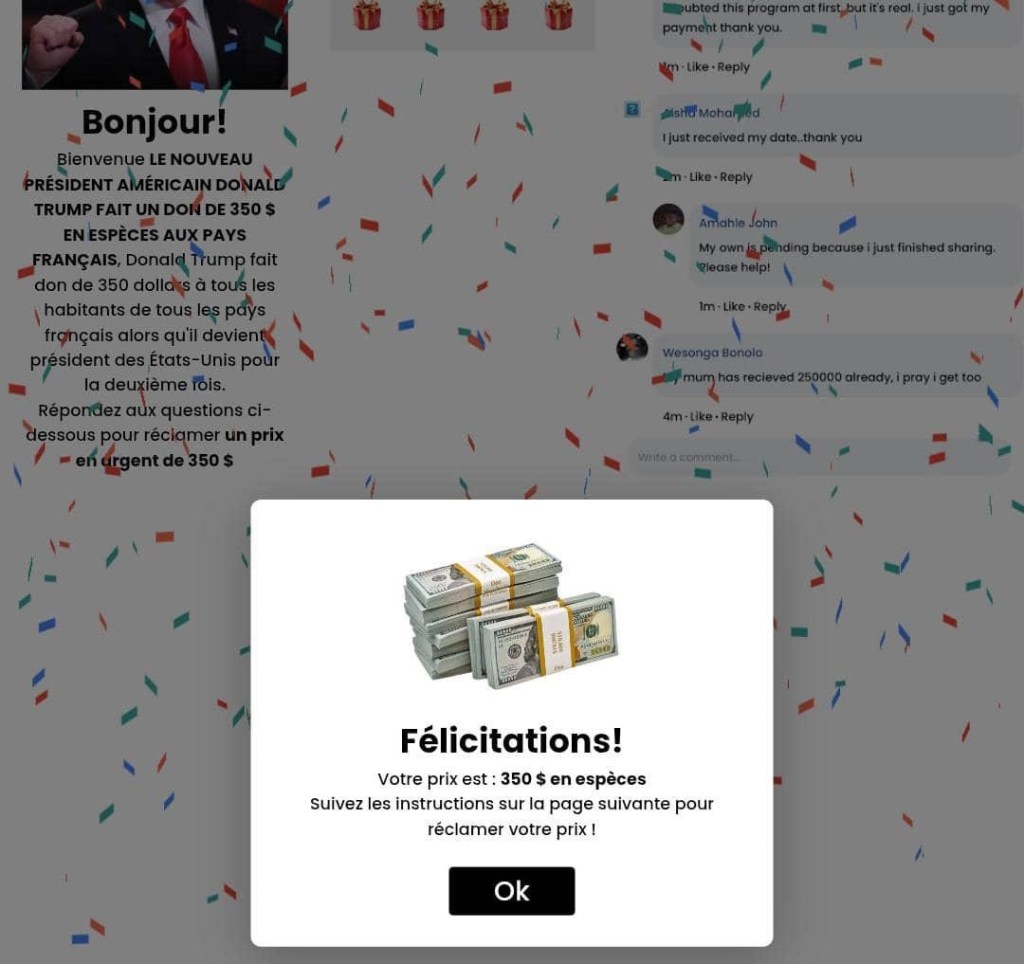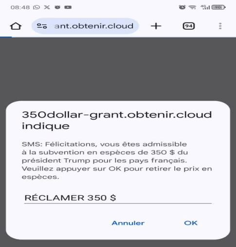 A l’ère du numérique, la prolifération de certaines plateformes peu fiables ou pas du tout crédibles est de plus en plus constatée. C’est le cas du site 350dollar-grant.obtenir.cloud qui aurait été créé pour doter les internautes d’une forte somme. Et pour toucher plus de cibles, les instigateurs de ce genre d’action ont rédigé un texte à but incitatif relayé sur les réseaux sociaux et sur Internet. « DONALD TRUMP SUBVENTION DE 350 $ POUR TOUS LES PAYS FRANÇAIS. COMMENT L’OBTENIR ? Visitez le lien ci-dessous et répondez aux questions suivantes et vous recevrez 350 $ instantanément. Je viens de recevoir le mien. Cliquez ici https://350dollar-grant.obtenir.cloud », tel est le texte qui vise à attirer plus de personnes. Mais rien de tout cela n’est vrai. Il s’agit d’une supercherie.