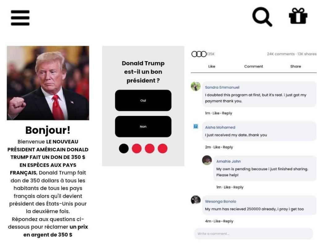 « Donald Trump est-il un bon président ? Avez-vous soutenu Donald Trump ? Choisissez votre sexe. Sélectionnez votre tranche d’âge. » Ce sont les quatre étapes qui composent le sondage. Après quoi, l’internaute devrait recevoir son cadeau, du moins quand on se fie au message d’invitation.