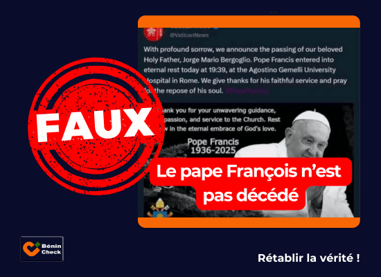 Cette information surprise est véhiculée par le biais d’une image. On y trouve une photo du pape François représenté avec les deux mains jointes. Sur cette image est inscrit un texte en anglais. « Thank you for your unwavering guidance, compassion, and service to the Church. Rest now in the eternal embrace of God’s love. Pope Francis 1936-2025 », lit-on. Ce qui veut dire en français « Merci pour vos conseils inébranlables, votre compassion et votre service à l’Église. Reposez maintenant dans l’étreinte éternelle de l’amour de Dieu. Pape François 1936-2025 ».