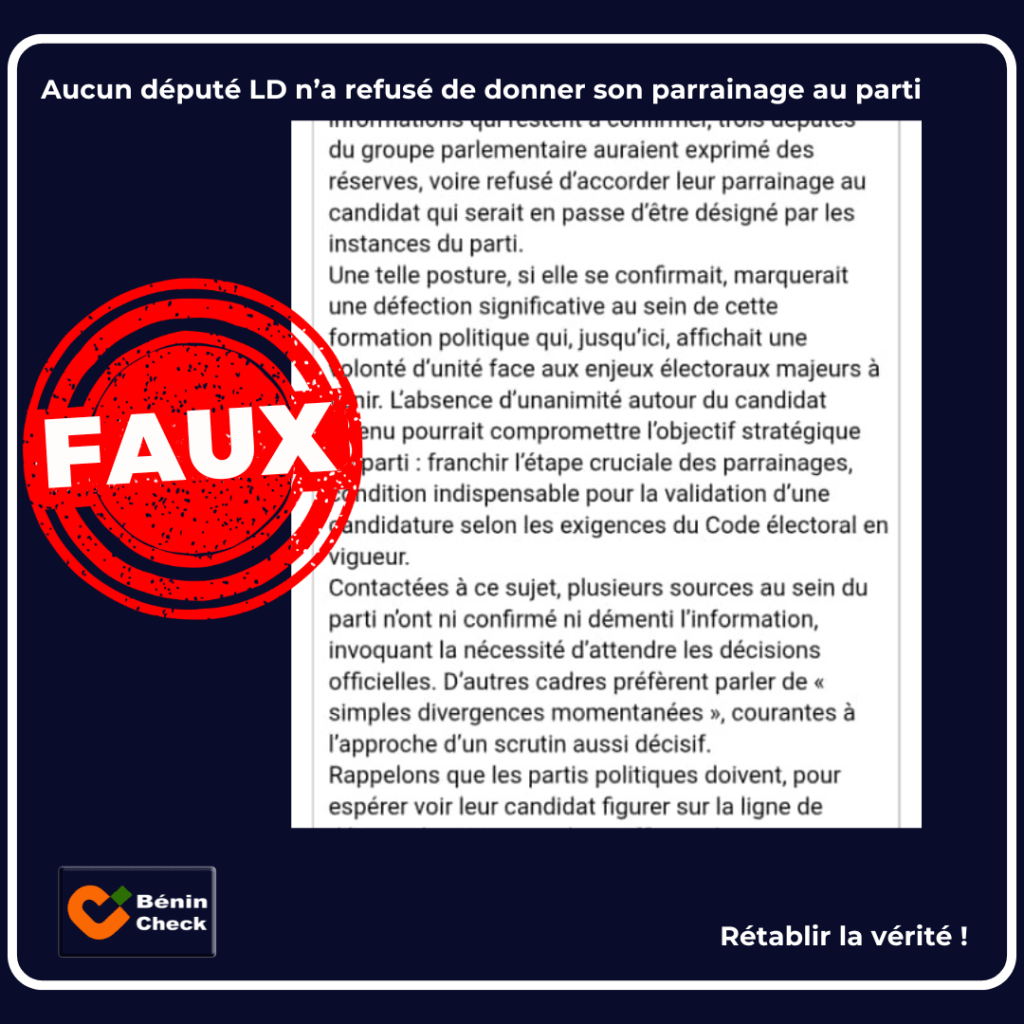 En l’absence de preuves tangibles et au vu du démenti ferme du parti, l’affirmation selon laquelle trois députés de Les Démocrates auraient refusé leur parrainage est non fondée. Le retrait du post par TVC Bénin, sans rectificatif ni explication, renforce la suspicion d’une information erronée. Reste que la capture continue de circuler sur WhatsApp, alimentant une rumeur déjà démentie.